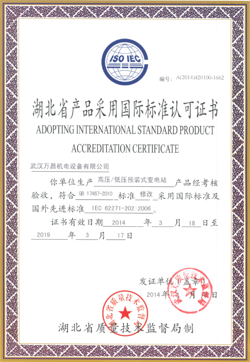 湖北省產(chǎn)品采用國際標準認可證書(箱變)